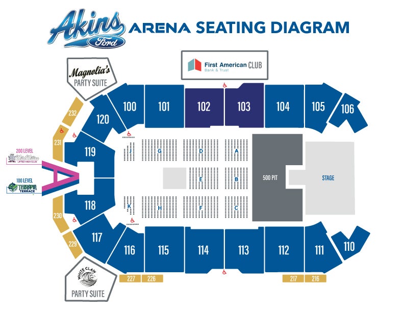 All Akins Ford Arena ticketed performances and sporting events will require patrons to carry their personal items in a clear bag. Backpacks, camera bags, binocular bags, and computer bags are prohibited. Personal items must be secured in a clear bag no larger than 12”x 6” x 12”. Wallets smaller than 5” x 8” x 2” will be accepted at entry.